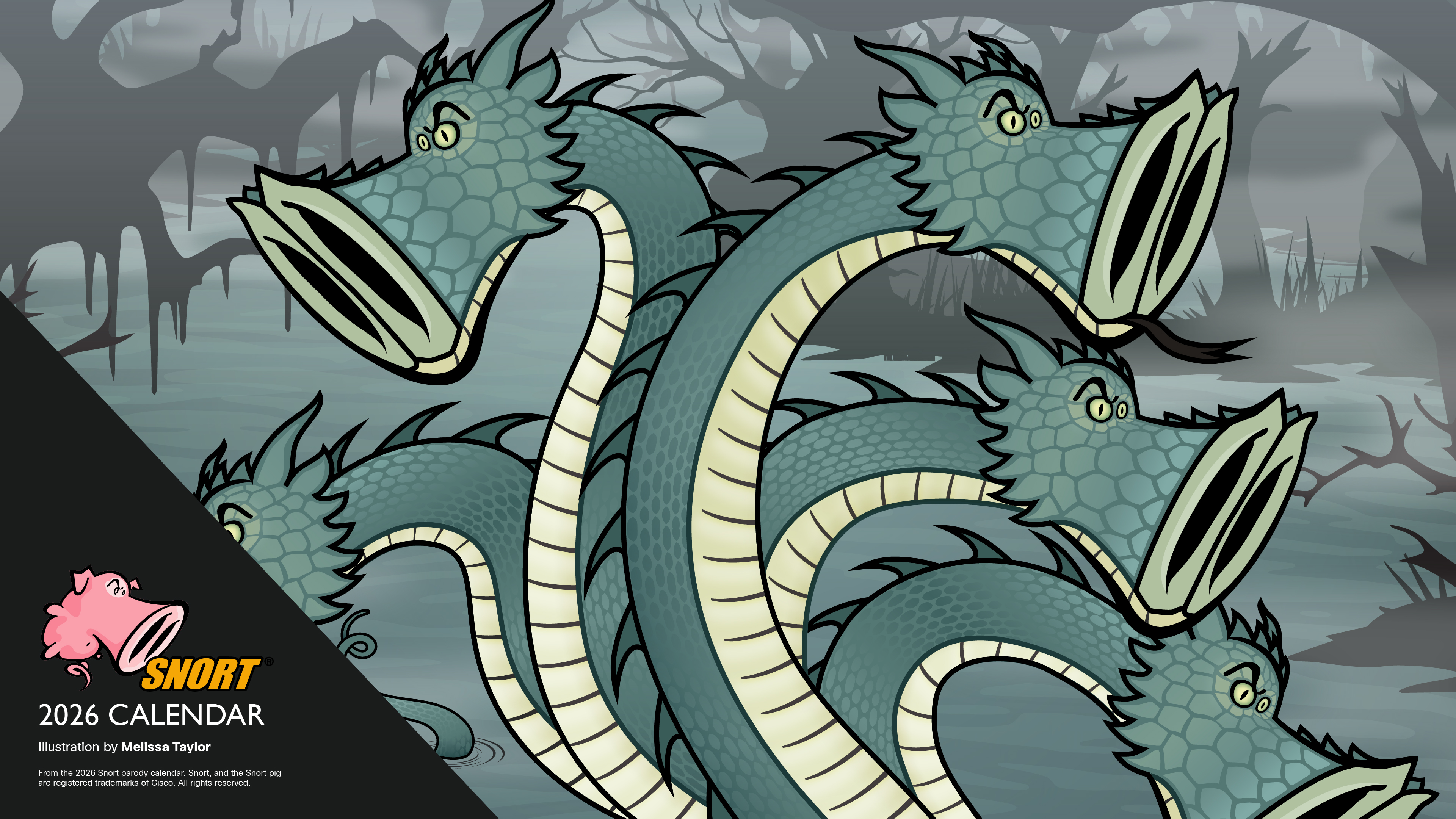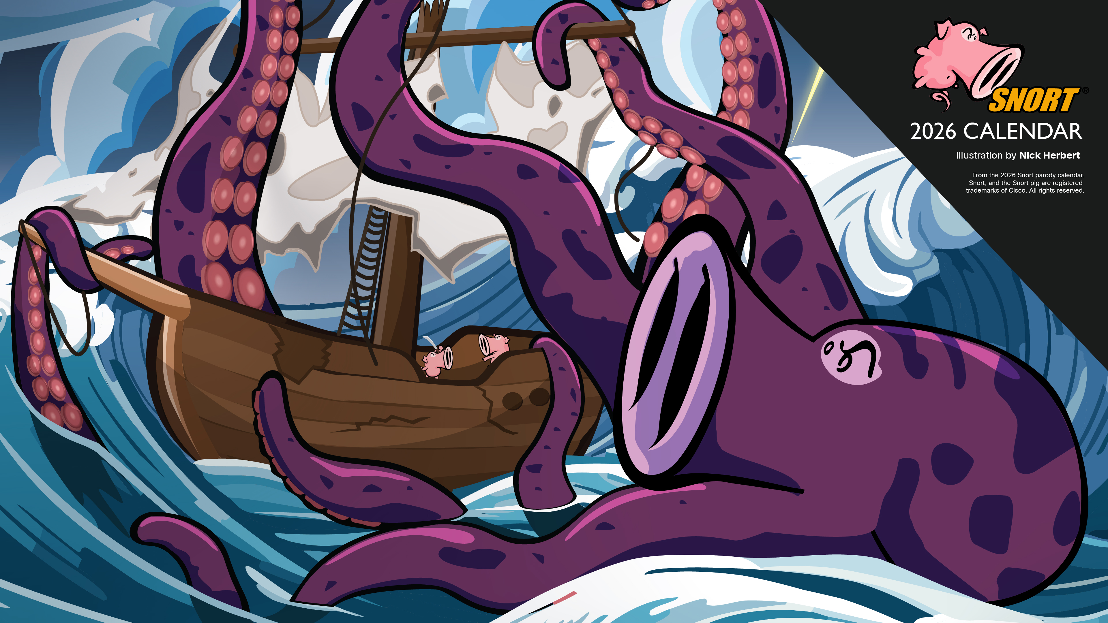 All images are from the 2026 Snort parody calendar. Snort and the Snort pig are registered trademarks of Cisco. All rights reserved. Alterations are strictly prohibited.